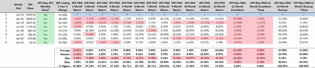 Quantifying January’s price action reveals some interesting data. January finished with a new all-time high monthly close and trailing two-year returns exceeding 40%. Since 1950, there have been only seven other Januarys that meet this criteria.