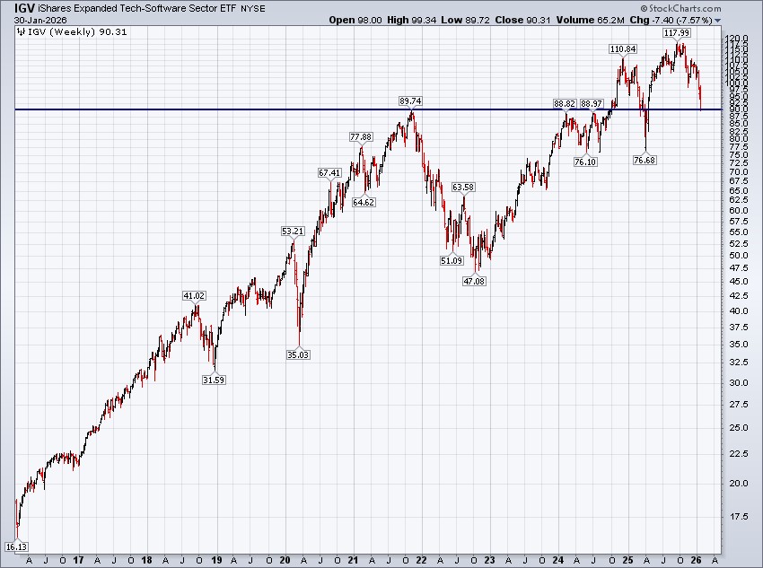 - Software gets clobbered...there's blood in the streets in the software space.The iShares Expanded Tech-Software Sector ETF (IGV) fell -7.57%. We're not the type to catch a falling knife, but IGV's going on five years of absolutely nothing at current levels (see the chart below) and that suggests there are opportunities within the space.