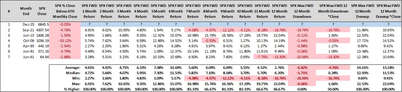 Since 1950, there have been just six prior instances of this pattern occurring (with December 2025 marking the seventh). While there is nothing statistically significant to take away from an event that has occurred only six times over more than 70 years, we do find it interesting that, in every prior case, the S&P 500 simply dusted itself off and returned to its winning ways.