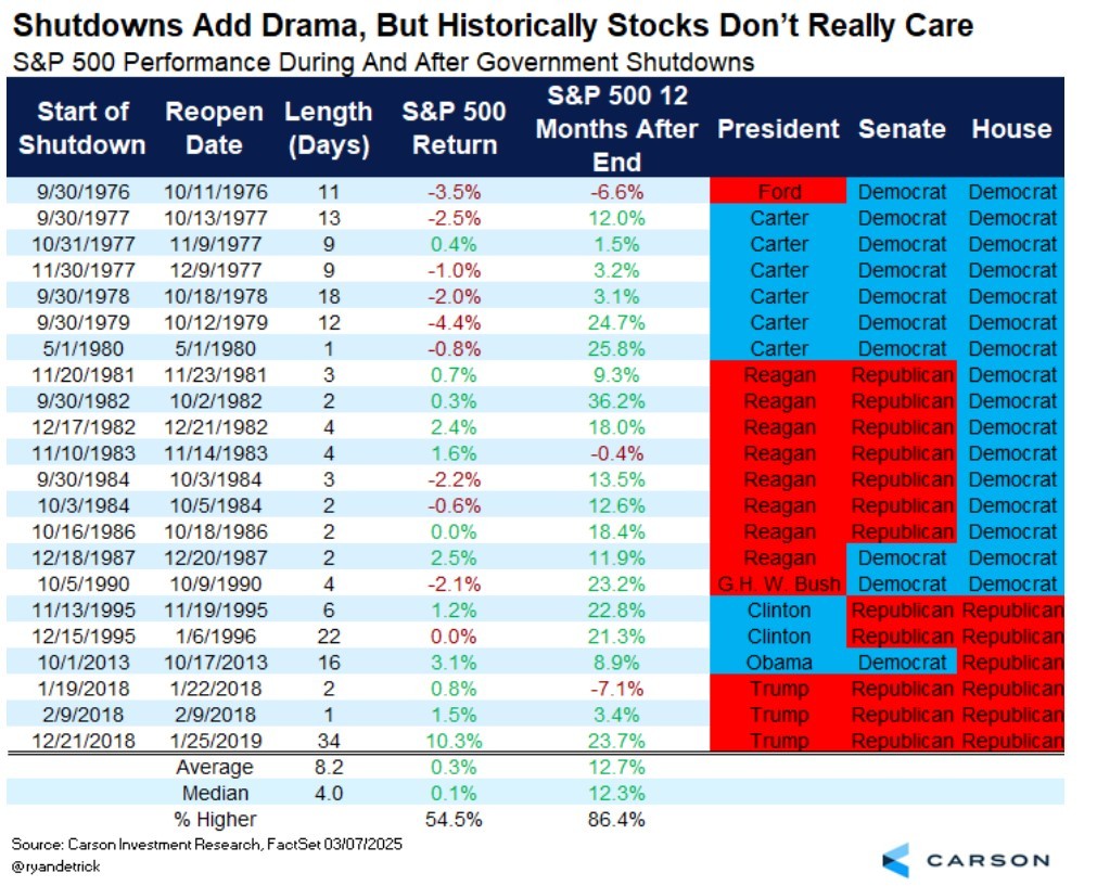 Speaking of not making sense, Ryan Detrick of Carson Group shared how the S&P 500 has traded in all prior government shutdowns. On average, government shutdowns have been a giant nothing burger and anything but a harbinger of doom.