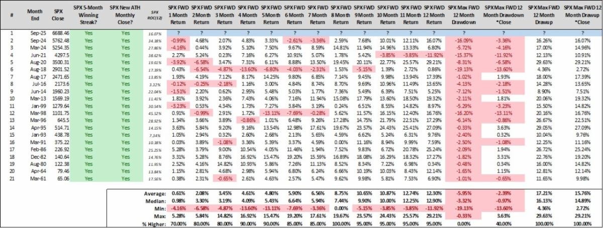 As always, this guarantees us absolutely nothing about the future, and the past can't be used to consistently predict the future. That said, it teaches us that this can continue, meaning the S&P 500 can continue to rise into the future - no matter how strong the last five months have been. Anyone who is telling you the last five months are a sign of trouble to come is misinformed. Trouble certainly could come, anything is always possible, but it won't be because the month of September closed at a five-month winning streak and a new all-time high monthly close.